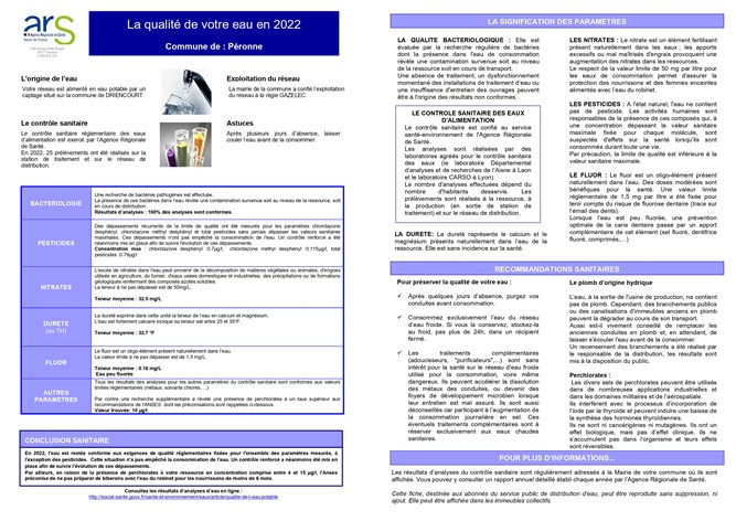Vous trouverez ci dessous la fiche de synthèse relative à la qualité de l’eau destinée à la consommation humaine distribuée par la commune de Péronne au cours de l’année 2022 :